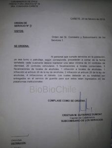 Se trata de una Orden de Servicio emitida en la 3ª Comisaría de Cañete con fecha de hoy, 20 de febrero, firmada por el capitán de Carabineros y Subcomisario de Servicios, Cristián Gutiérrez Dumont. En ella, se ordena al personal de servicio, de turno o de patrullaje, cumplir una cantidad mínima de controles de identidad, vehiculares y fiscalizaciones a locales comerciales.
