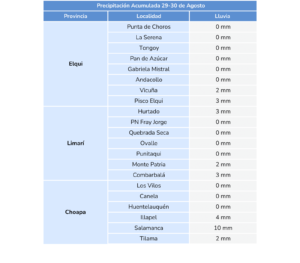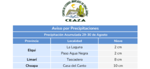 Se pronostican precipitaciones de lluvia y nieve en la región de Coquimbo desde la tarde del día jueves 29 hasta la mañana del día viernes 30 de agosto. La zona cordillerana de las provincias del Choapa y Limarí concentraría la mayor cantidad de nieve, mientras que localidades precordilleranas del Choapa recibirían los montos de lluvia más altos. Las precipitaciones podrían venir acompañadas de actividad eléctrica.