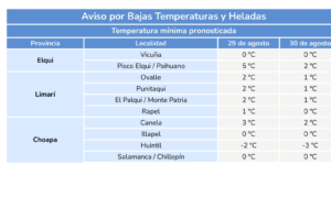 A su vez, se pronostican temperaturas bajo lo normal para la época del año en la región de Coquimbo para los días jueves 29 y viernes 30 de agosto, con probables heladas en valles interiores.