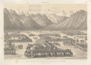 Parlamento celebrado por el ya gobernador del reino, don Ambrosio O’Higgins, en el pintoresco campo de Negrete, y cuya vista general constituye la lámina número cuatro del atlas de la Historia de Chile por Gay, dibujada por este.